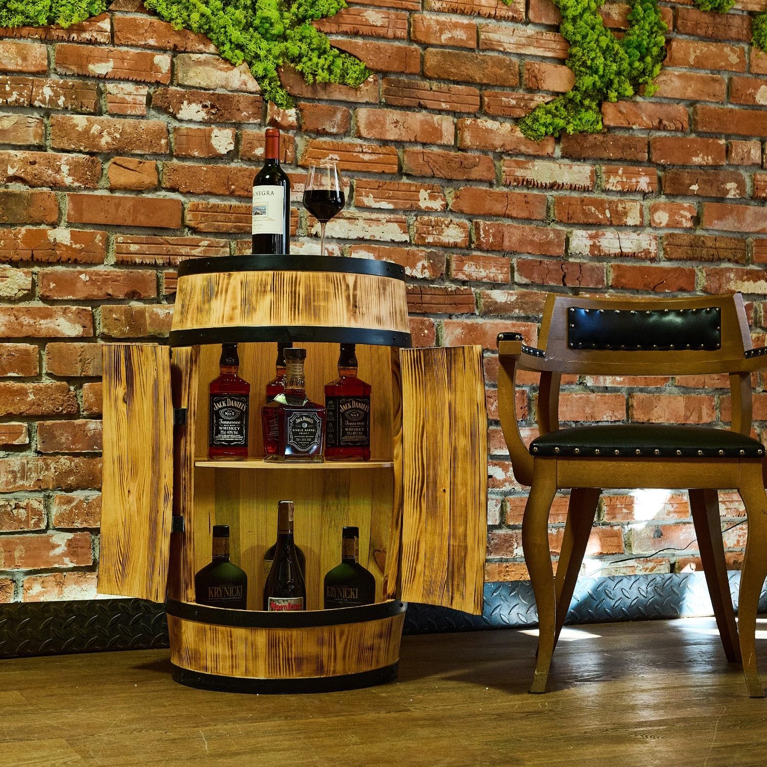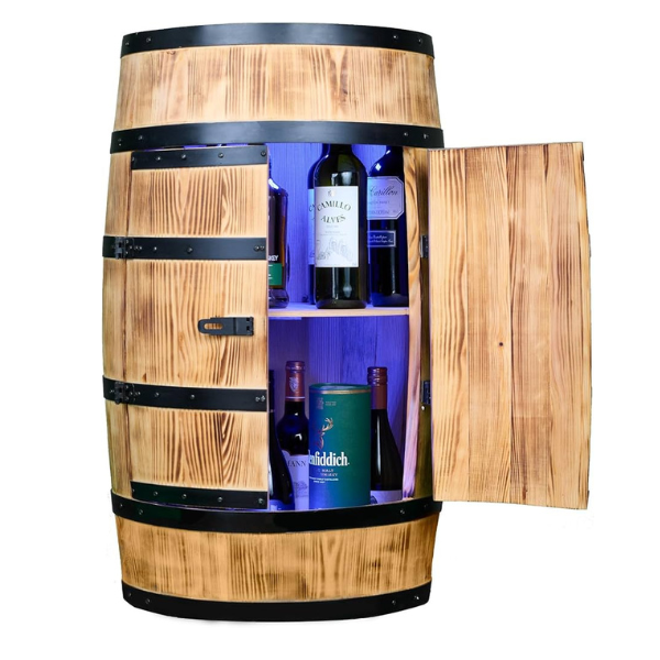 Découvrez le Bar Tonneau Led en Bois avec 2 Portes - 2 Étagères, une pièce maîtresse élégante pour votre intérieur. Fabriqué à partir de bois vintage, ce mini bar en forme de tonneau se distingue par son allure unique et sophistiquée.