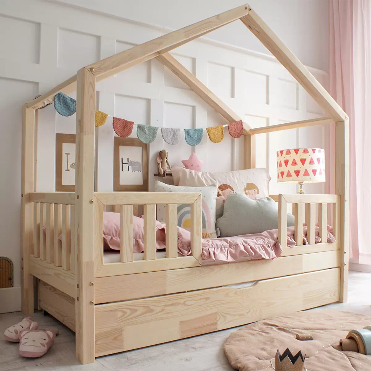 Son design ludique avec toit stimule l'imagination des enfants, tandis que les barrières amovibles assurent leur sécurité pendant le sommeil. Pratique pour les familles accueillant souvent des amis, son tiroir intégré se transforme aisément en couchage supplémentaire.