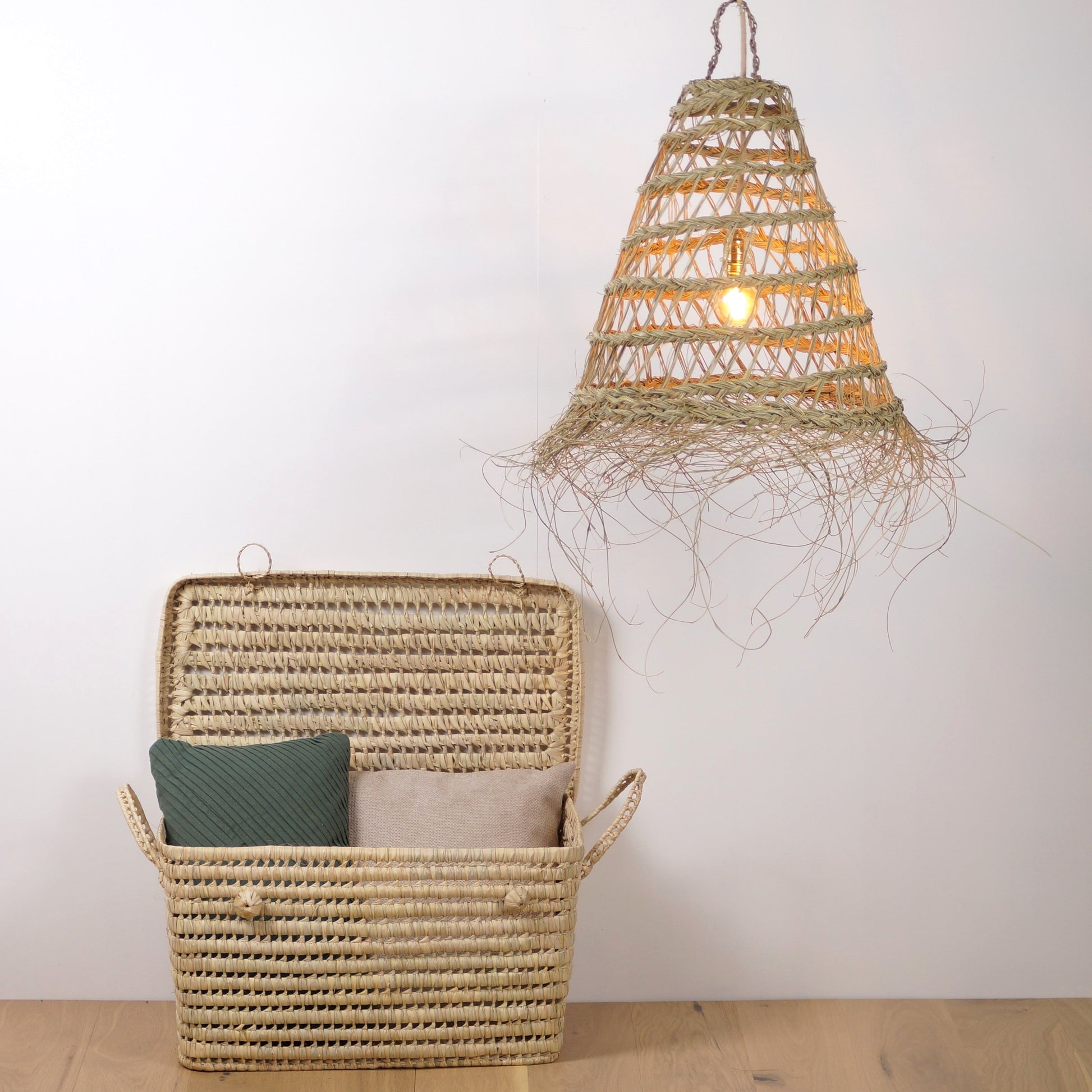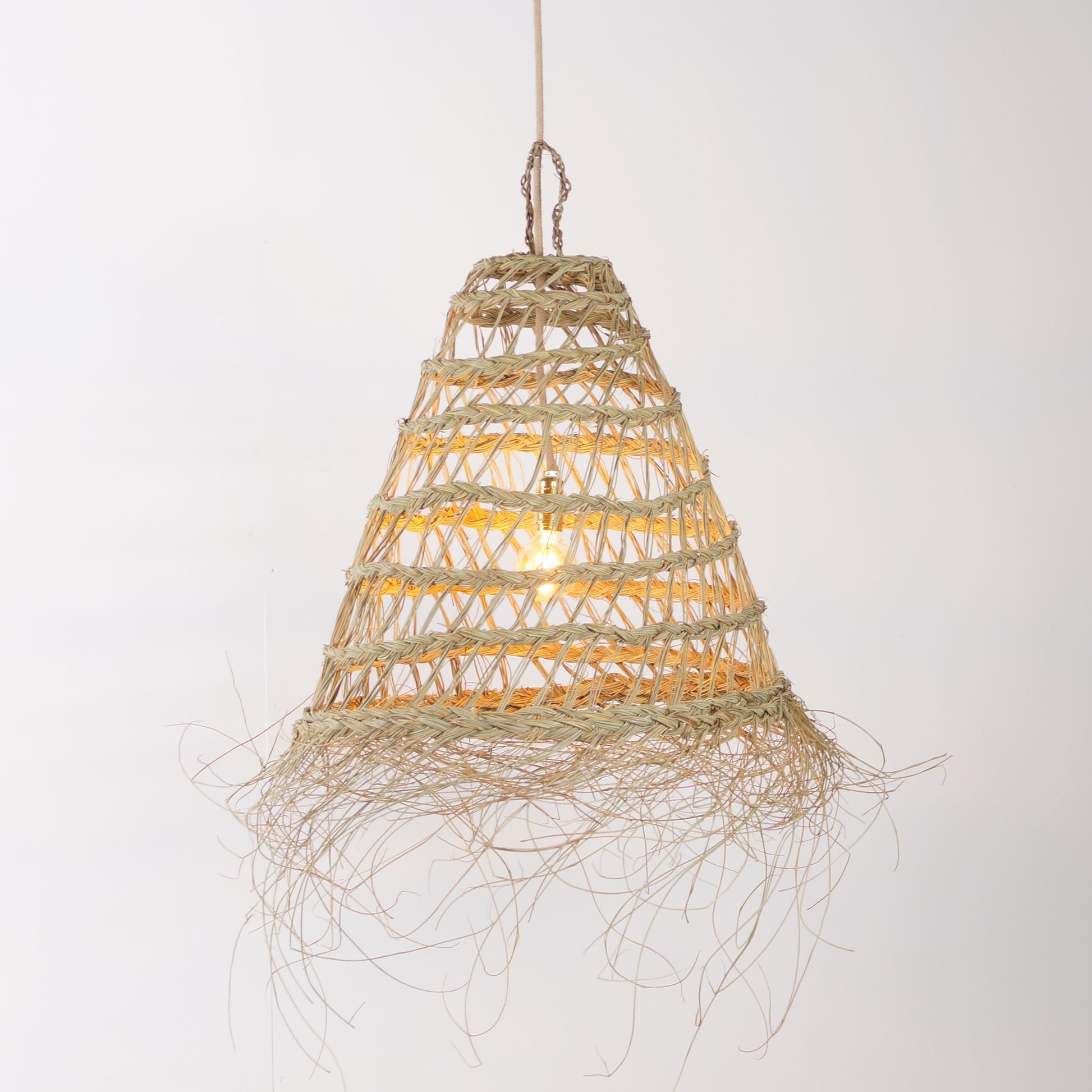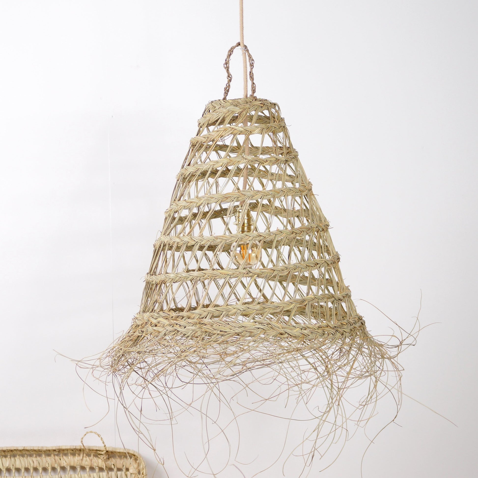 Fabriquée à la main par des artisans talentueux à partir de fibres d'alfa naturelles, cette suspension incarne un charme bohème authentique qui saura captiver. Sa conception ajourée permet à la lumière de filtrer délicatement, créant une ambiance chaleureuse et accueillante.